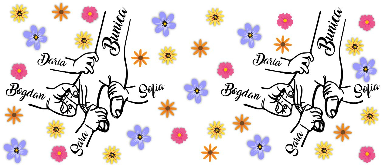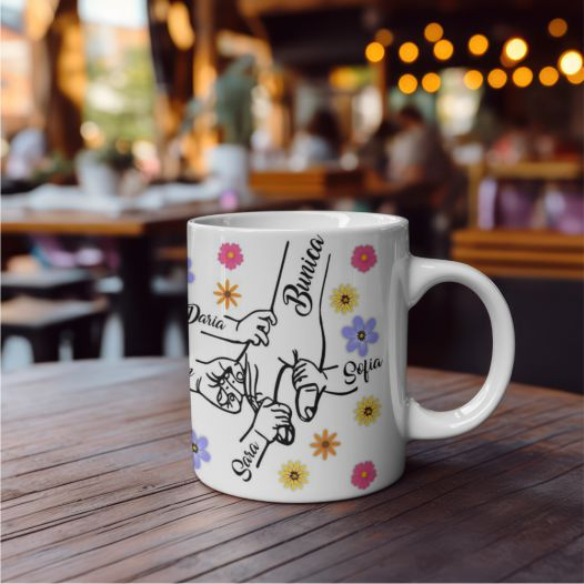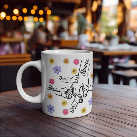 Cana poate fi personalizată cu numele dorite, care se pot schimba la alegere, transformând produsul într-o amintire unică de familie. Fiecare mânuță reprezintă un copil, iar mâna mare este sprijinul constant, cel care ține totul laolaltă, indiferent de timp sau distanță.
